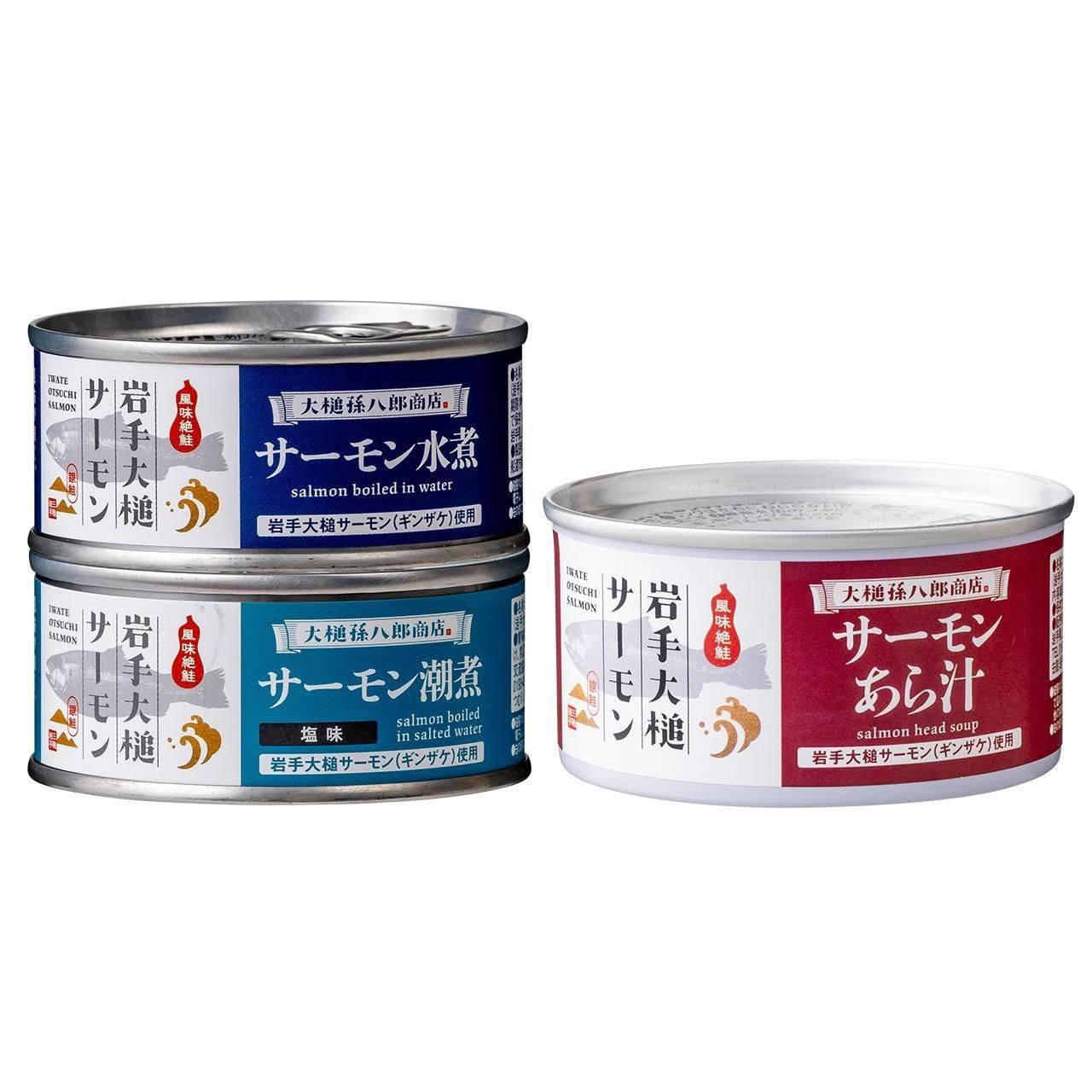 岩手大槌サーモンの美味しさを味わう、サーモン水煮・サーモン潮煮[塩味]・サーモンあら汁 の3缶セットです。