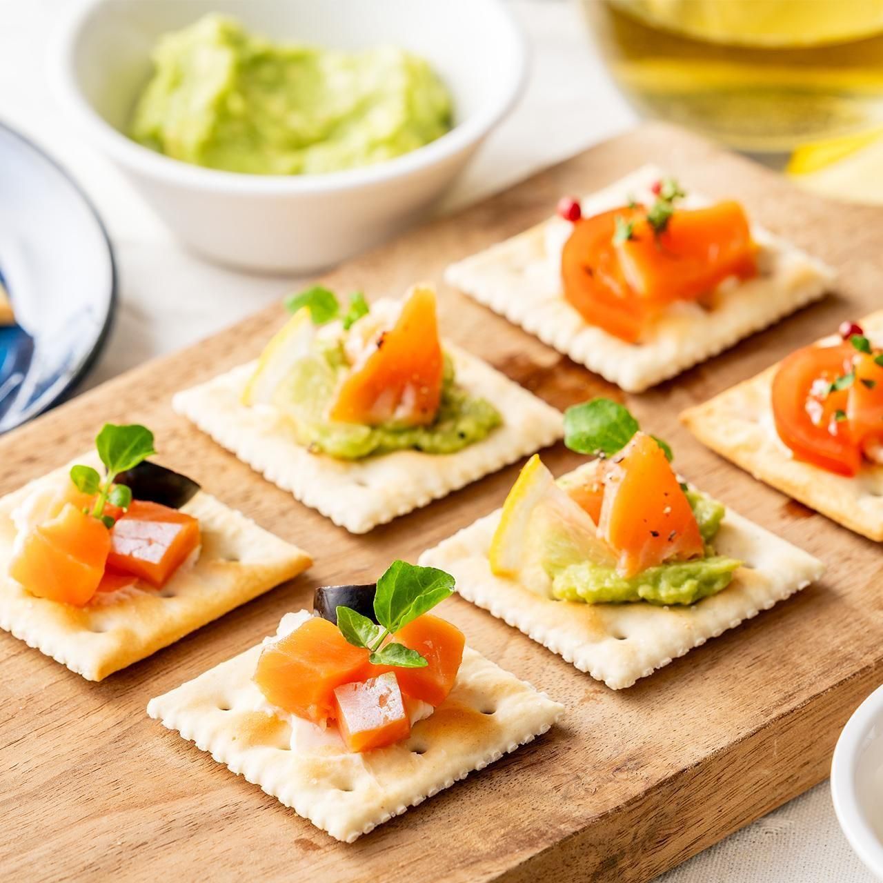 クラッカーに載せる際は、クリームチーズやアボカドのディップを載せるとサーモンのオレンジが引き立ちます。
